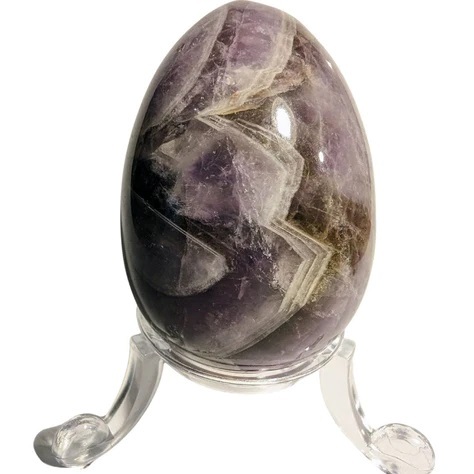 nvite serenity and spiritual growth into your space with our Captivating Amethyst Chevron Crystal Egg. Each egg is expertly shaped from Chevron Amethyst, exhibiting its distinct banded patterns and captivating purple hues.