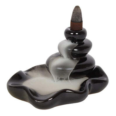 A stunningly simple backflow incense burner in a large black ceramic stacked pebble design. When the cone is lit the smoke from the cone cascades downwards in a mesmerising waterfall effect to pool at the bottom. Beautiful to watch.